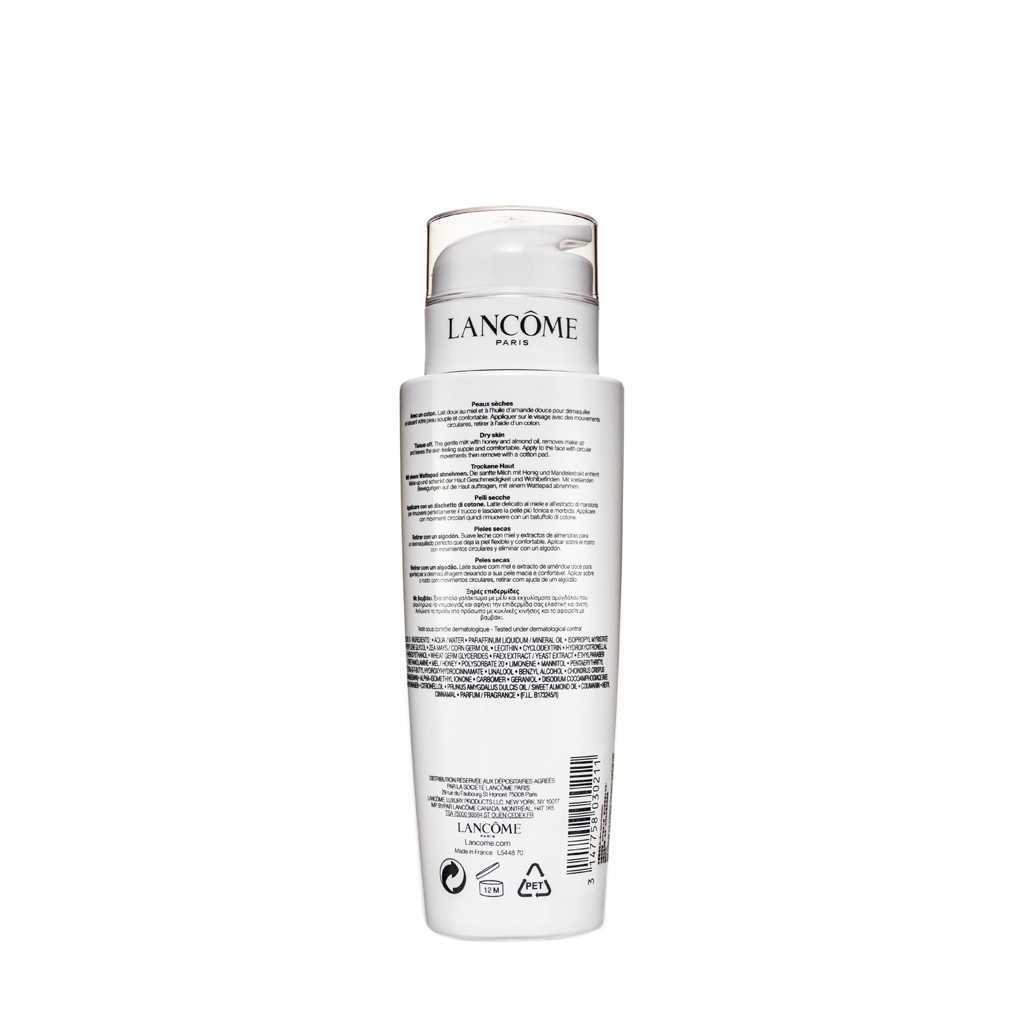 Lancôme Galatée Confort (50ml) Enriched with botanical ingredients to gently remove makeup and residues while replenishing moisture and nourishing skin, specifically suitable for dry skin. Skin is softened and smoothed from a comfortable cleansing experience.Product Features:• Nourishing: botanical essence including honey, almond and more moisturises and nourishes skin, alleviating dryness and tightening pores. Skin appears energised and cleansed.• Gentle cleansing: it removes makeup and dirt, while balancing water and oil level, replenishing and locking in moisture for increasing elasticity.• Silky-smooth texture: it mildly emulsifies and cleanses face, providing a comfortable cleansing experience.Ingredients:• Honey, Almond: Moisturize and tighten pores
